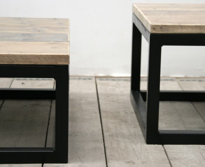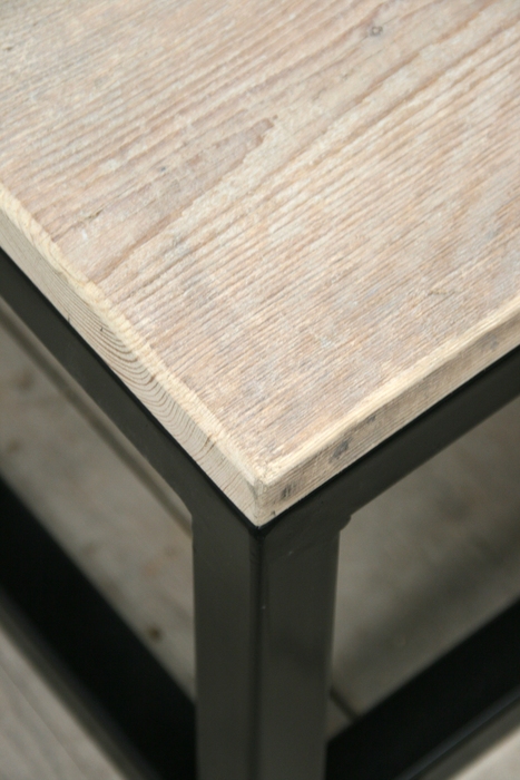 Een gedurfde bijzettafel met een blad van gebruikt steigerhout gecombineerd met een een ijzeren onderstel. Stoer, ruig, robuust en puur zijn kenmerkend voor deze bijzettafel. Een tafel die zowel in een landelijk rustiek maar ook in een modern interieur tot zijn recht komt. Stijlvol in uw interieur in combinatie met eenzelfde salontafel of gecombineerd met eenzelfde side-table. Het onderstel is in het zwart of wit gespoten leverbaar en het ijzeren profiel heeft een doorsnede van 4 cm. Op maat gemaakt in de door u gewenste afmetingen (lengte, breedte en hoogte).