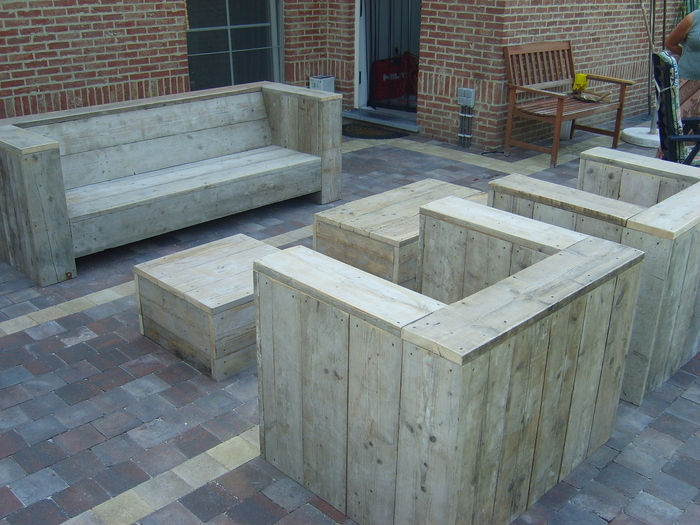 Deze loungeset van gebruikt steigerhout, met dichte achterzijde, bestaat standaard uit een bank, twee stoelen en twee hockers. Wij kunnen op maat gemaakte bijpassende kussens leveren in 24 frisse kleuren. Uiteraard zijn de meubels ook los verkijgbaar.