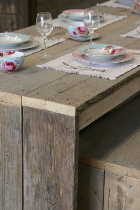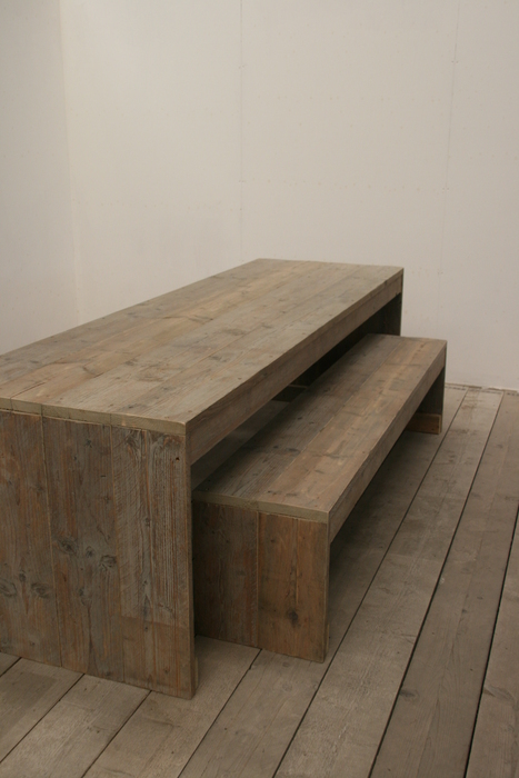 Een stevig uitgevoerde basis tafel gemaakt van gebruikt steigerhout. De tafel wordt vaak uitgebreid met bijpassende banken en krukjes. De ideale set om met familie en vrienden gezellig te tafelen voor zowel binnen als buiten. De afmeting van de tafel zoals afgebeeld is 250x80x75 cm (lxbxh).