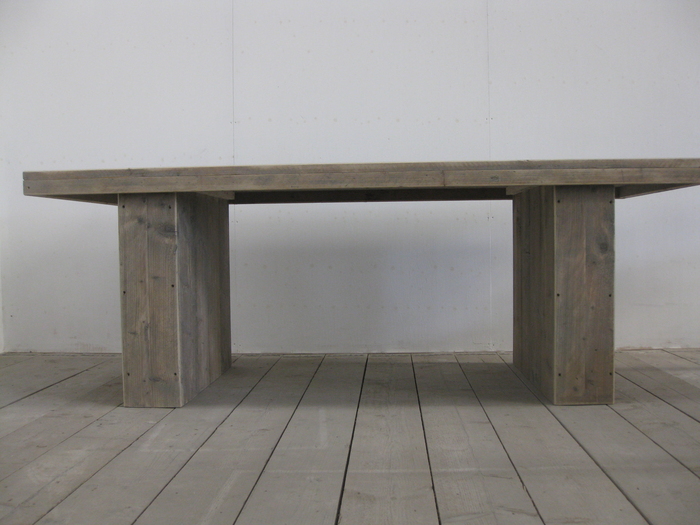 Een super stoere eettafel gemaakt van gebruikte steigerplanken, het onderstel is zeer stevig en robuust door de brede blokpoot over de gehele breedte van de tafel. Op maat gemaakt in de door u gewenste afmetingen (lengte, breedte en hoogte).