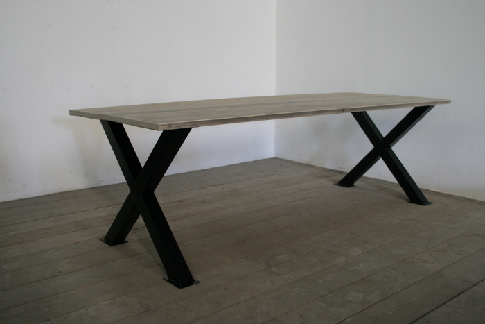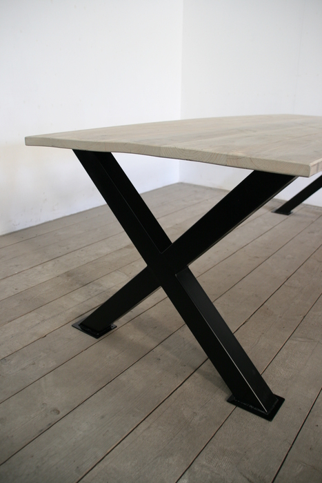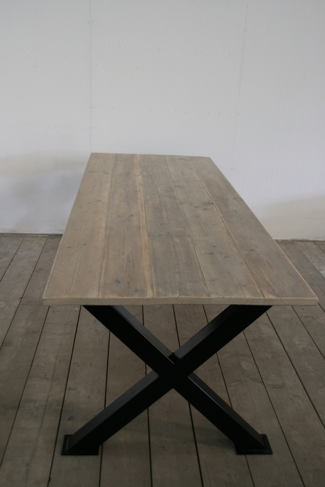 Het ijzeren onderstel kan in de kleur zwart of wit gespoten worden. Het tafelblad wordt geschuurd en desgewenst behandeld met steigerhoutbeits in de kleur white-, grey-, antracite- of black wash.