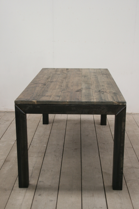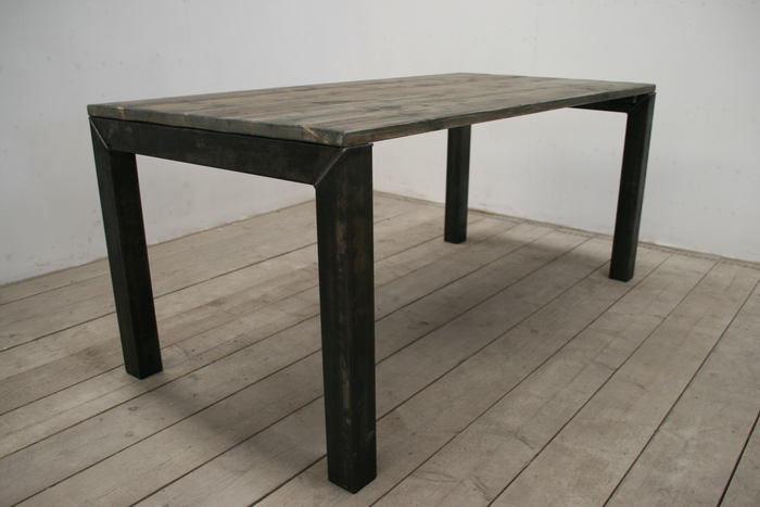 Het ijzeren onderstel is onbehandeld waardoor de tafel een ruig uiterlijk krijgt. Mooi in een strak modern interieur maar ook sfeervol in een romantisch landelijke inrichting. Het tafelblad wordt geschuurd en desgewenst behandeld met steigerhoutbeits in de kleur white-, grey-, antracite- of black wash. Het tafelblad van de tafel zoals afgebeeld is behandeld met de kleur antracite.