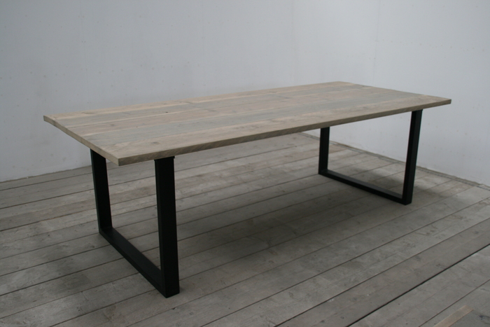 Het ijzeren onderstel wordt in eigen beheer gemaakt en kan in de kleur zwart of wit gespoten worden. Het tafelblad wordt mooi geschuurd en desgewenst behandeld met steigerhoutbeits in de kleur white-, grey-, antracite- of black wash.