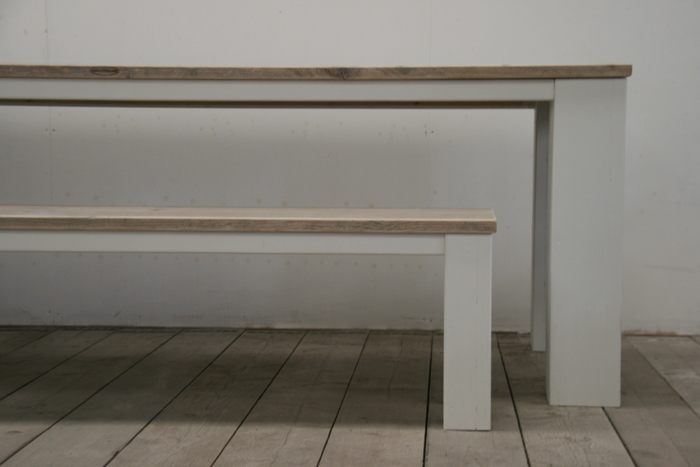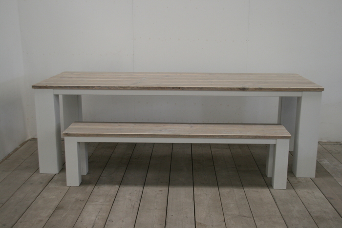 Een eettafel met een tafelblad gemaakt van gebruikte steigerplanken en strak wit gelakt onderstel. Door de pure uitstraling is deze tafel tijdloos en sfeervol. Op maat gemaakt in de door u gewenste afmetingen (lengte, breedte en hoogte).