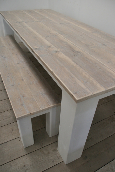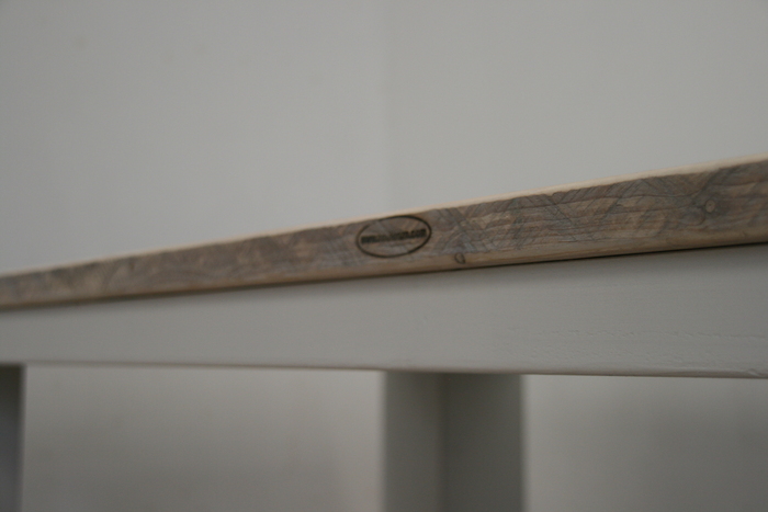 Het tafelblad wordt geschuurd en desgewenst behandeld met steigerhoutbeits in de kleur white-, grey-, antracite- of black wash.