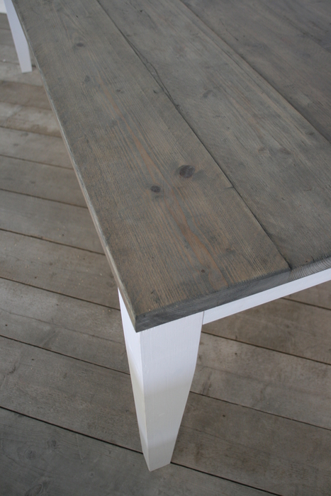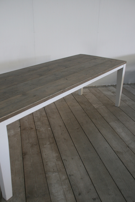 Een charmante eettafel met een tafelblad gemaakt van gebruikte steigerplanken en fraaie wit gelakte poten. Op maat gemaakt in de door u gewenste afmetingen (lengte, breedte en hoogte).